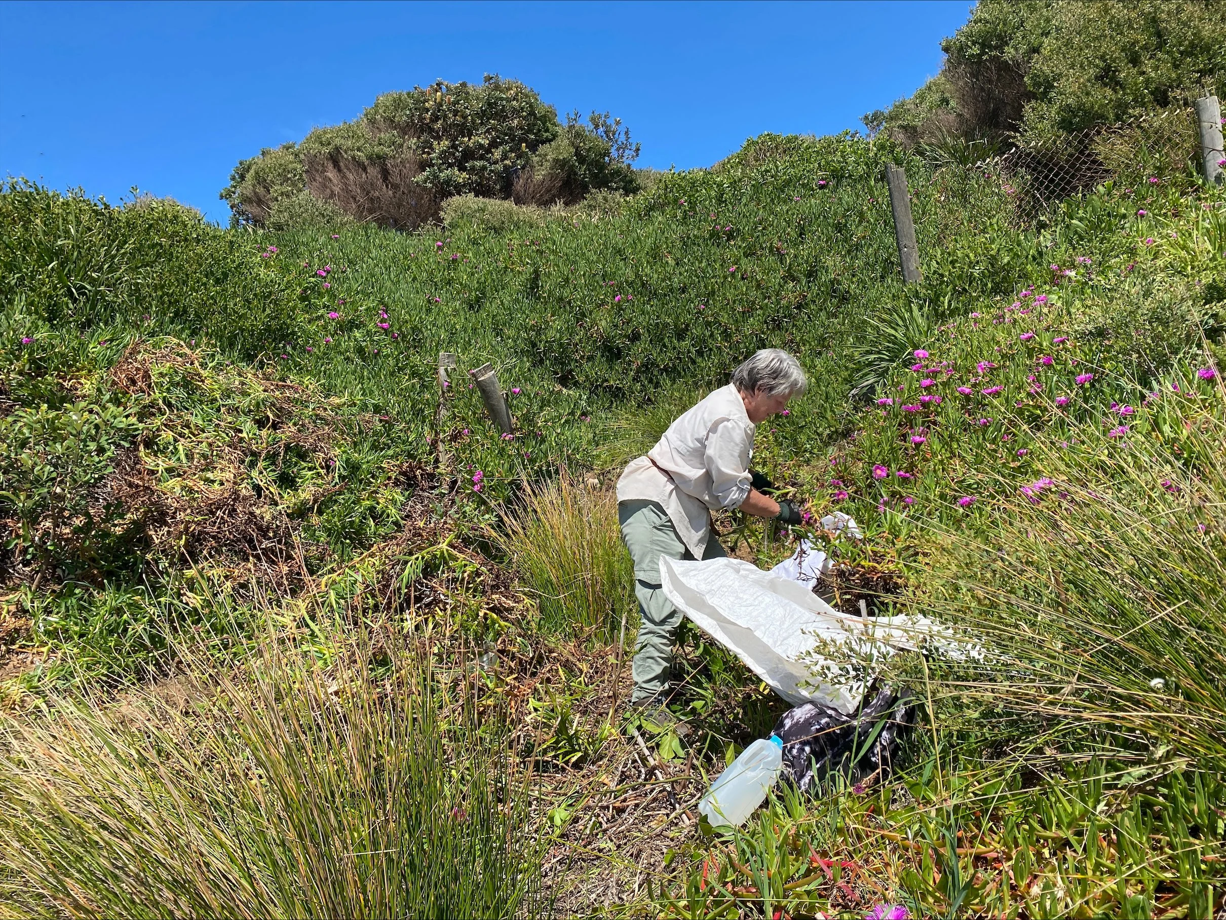 Julie focused her efforts at the top of the site, tirelessly working to remove Asparagus Fern — crowning, scraping, and poisoning where needed — and also cleared more Pigface from that area.