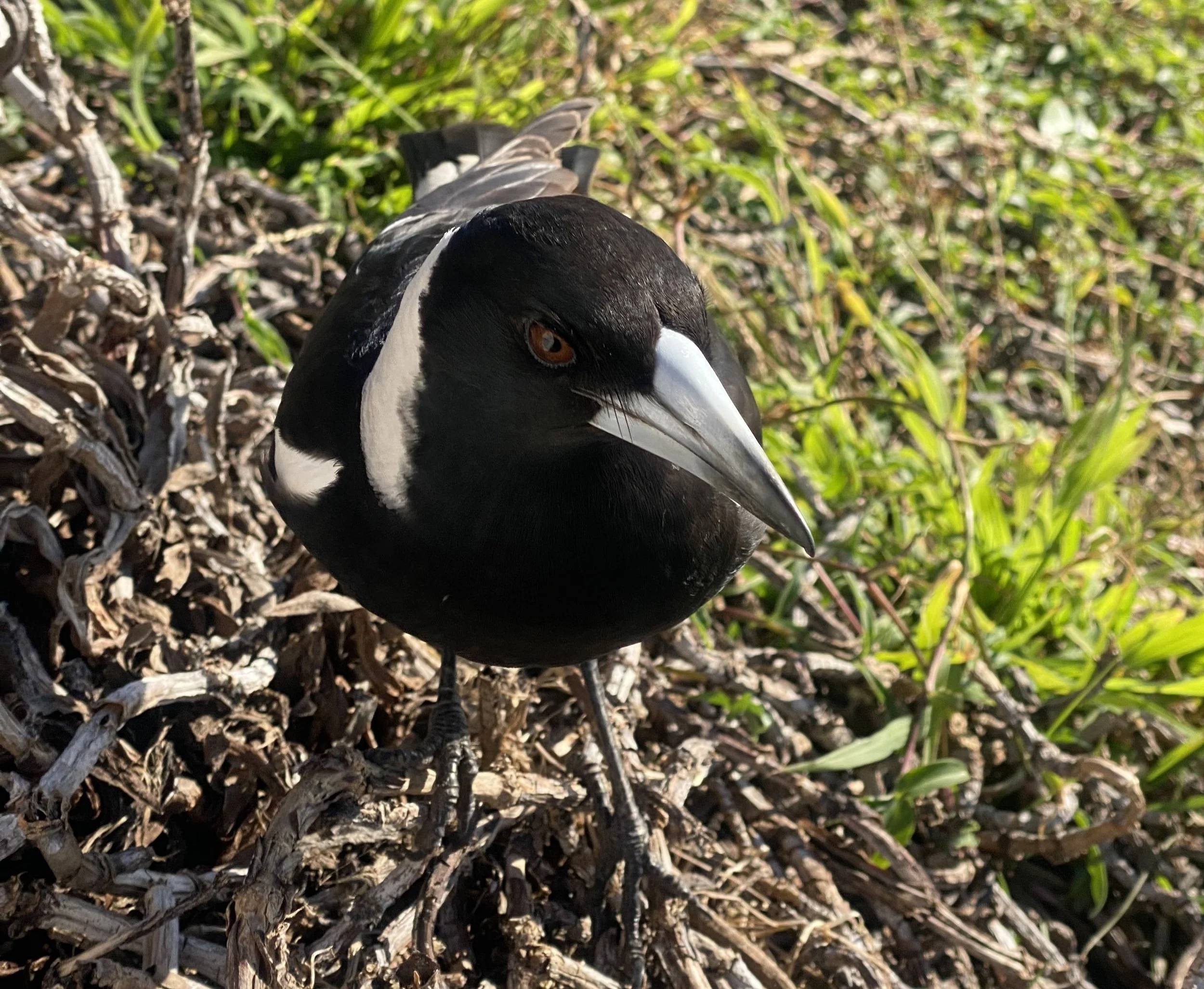 One of the magpies checking out Leila, or seeing if she has any food of interest – photo by Mary Clarkson