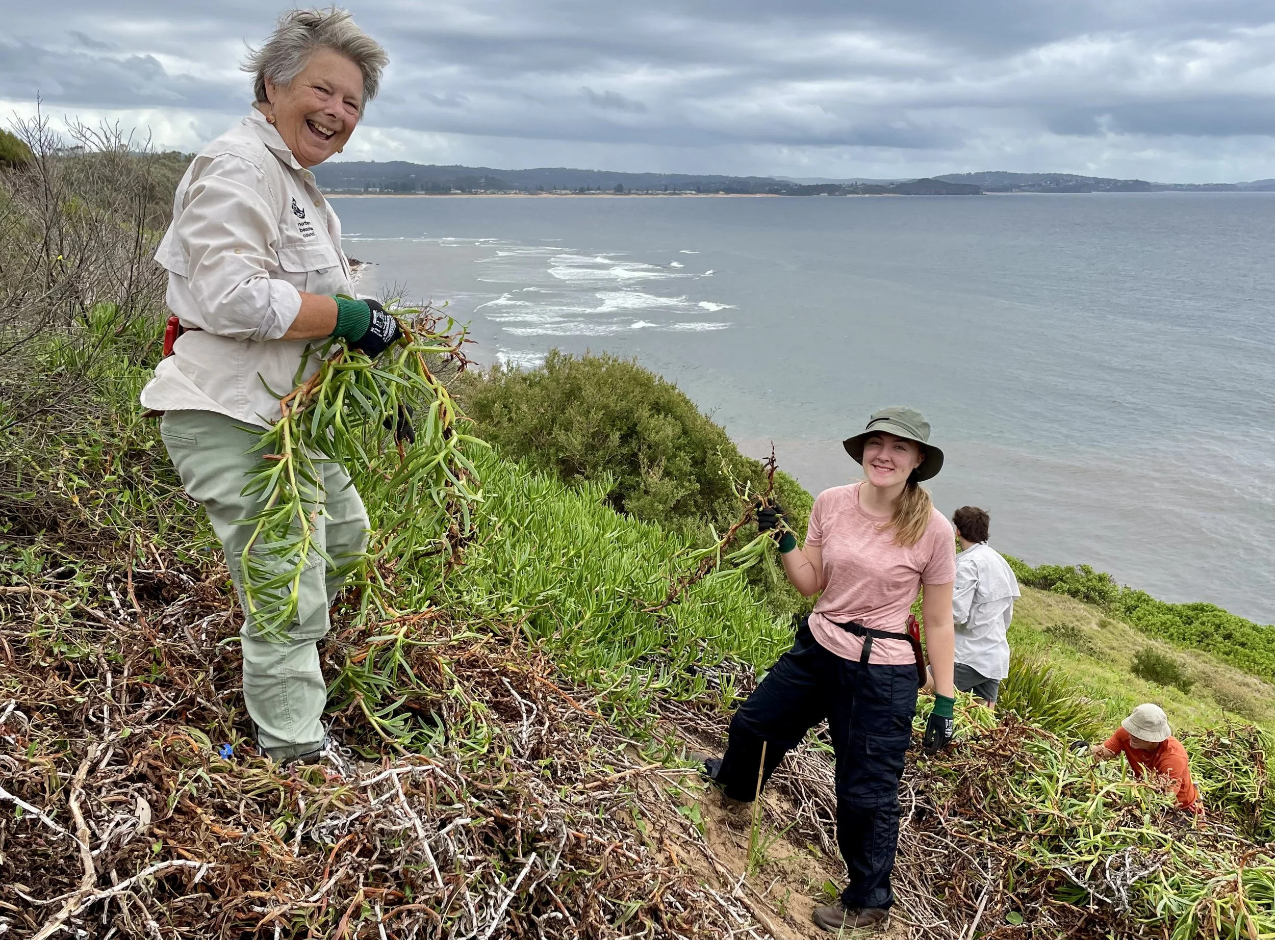After morning tea we continue working in the quiet drizzle, with Lisa working on the Oat grass and Merrilyn working on the ever-growing Bitou.
