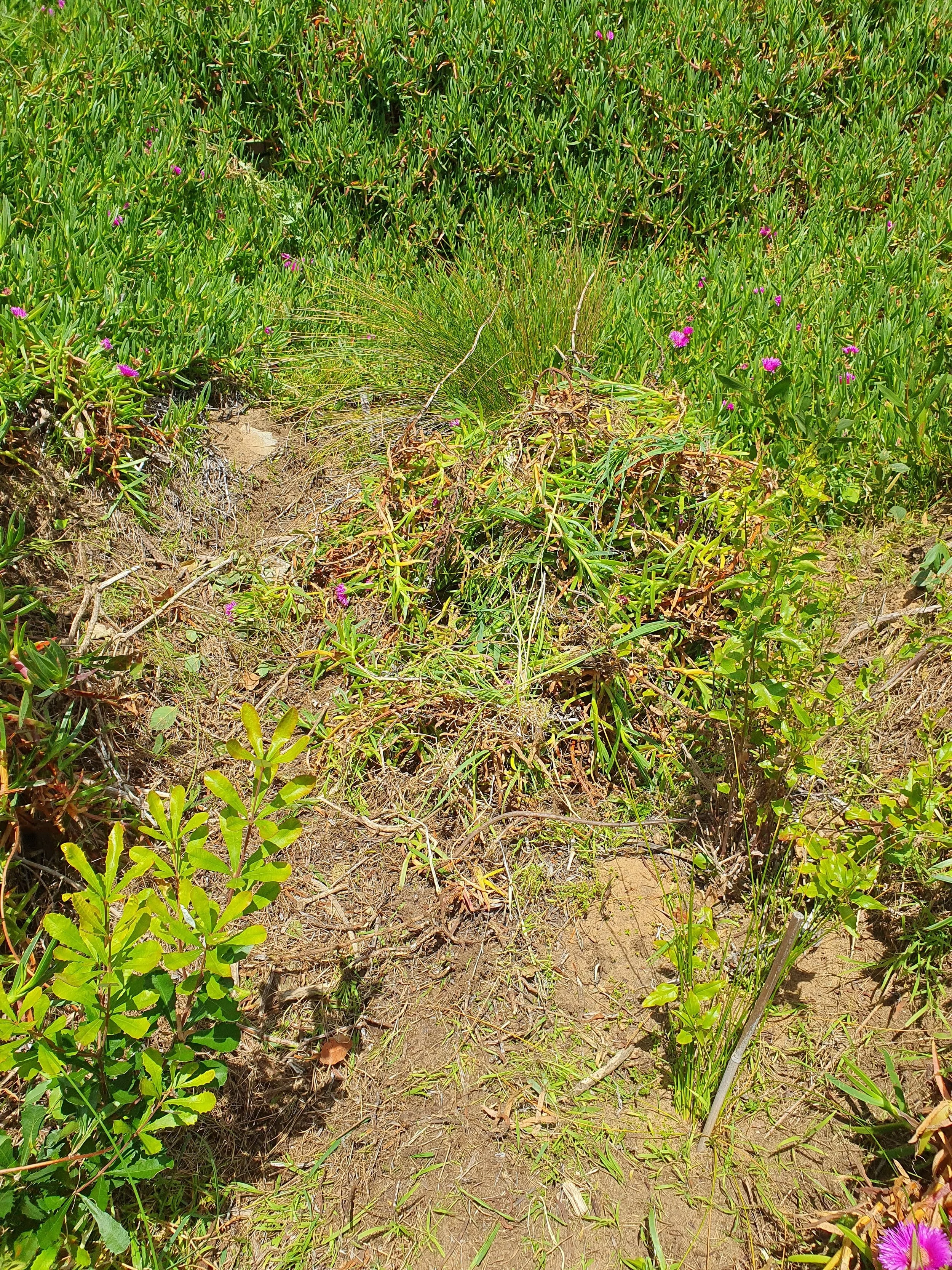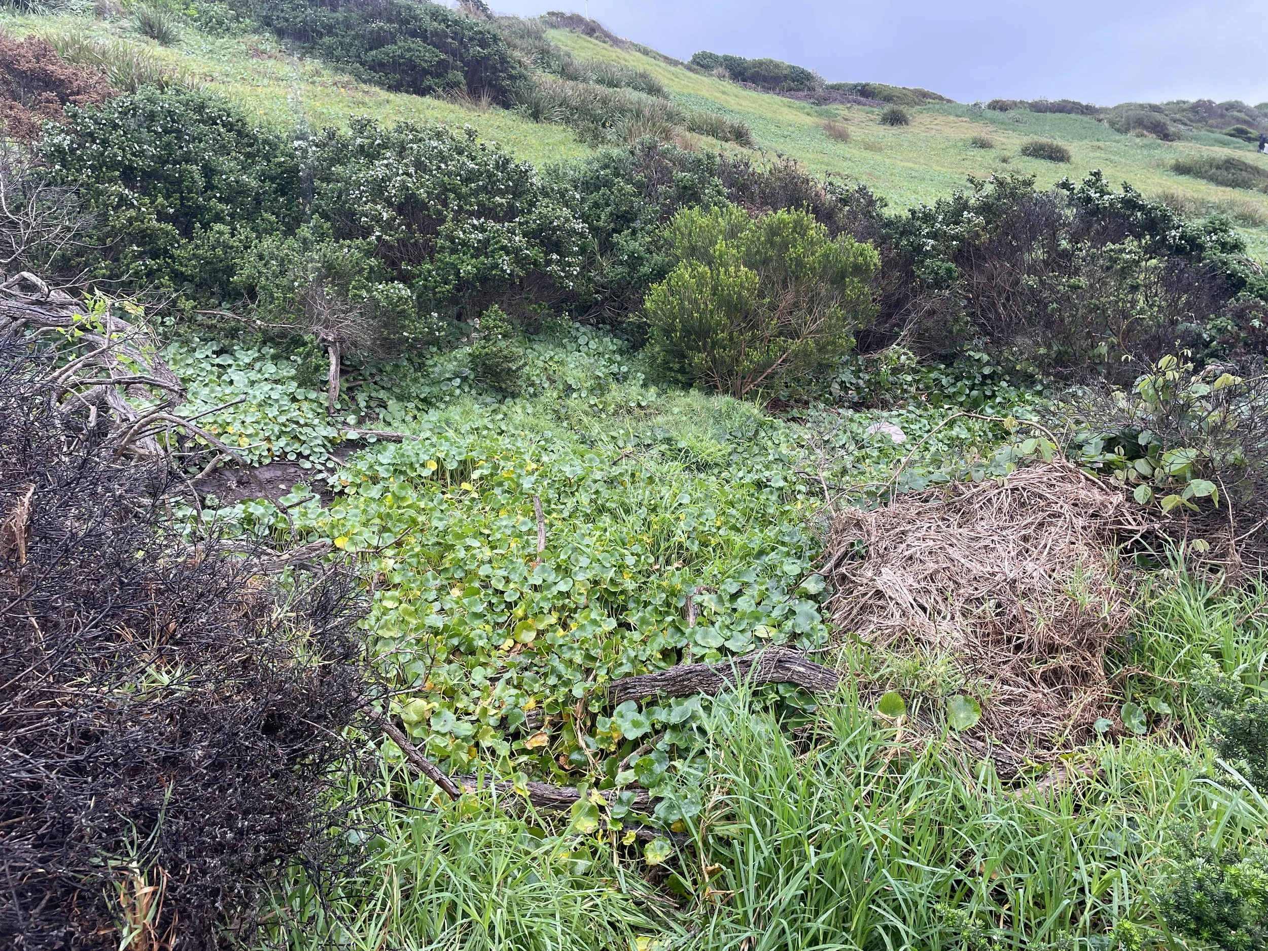 We pulled out a large amount of pig’s face on the slope. You can tell it is non-native by the long green leaves which are like a carpet over smaller native plants.