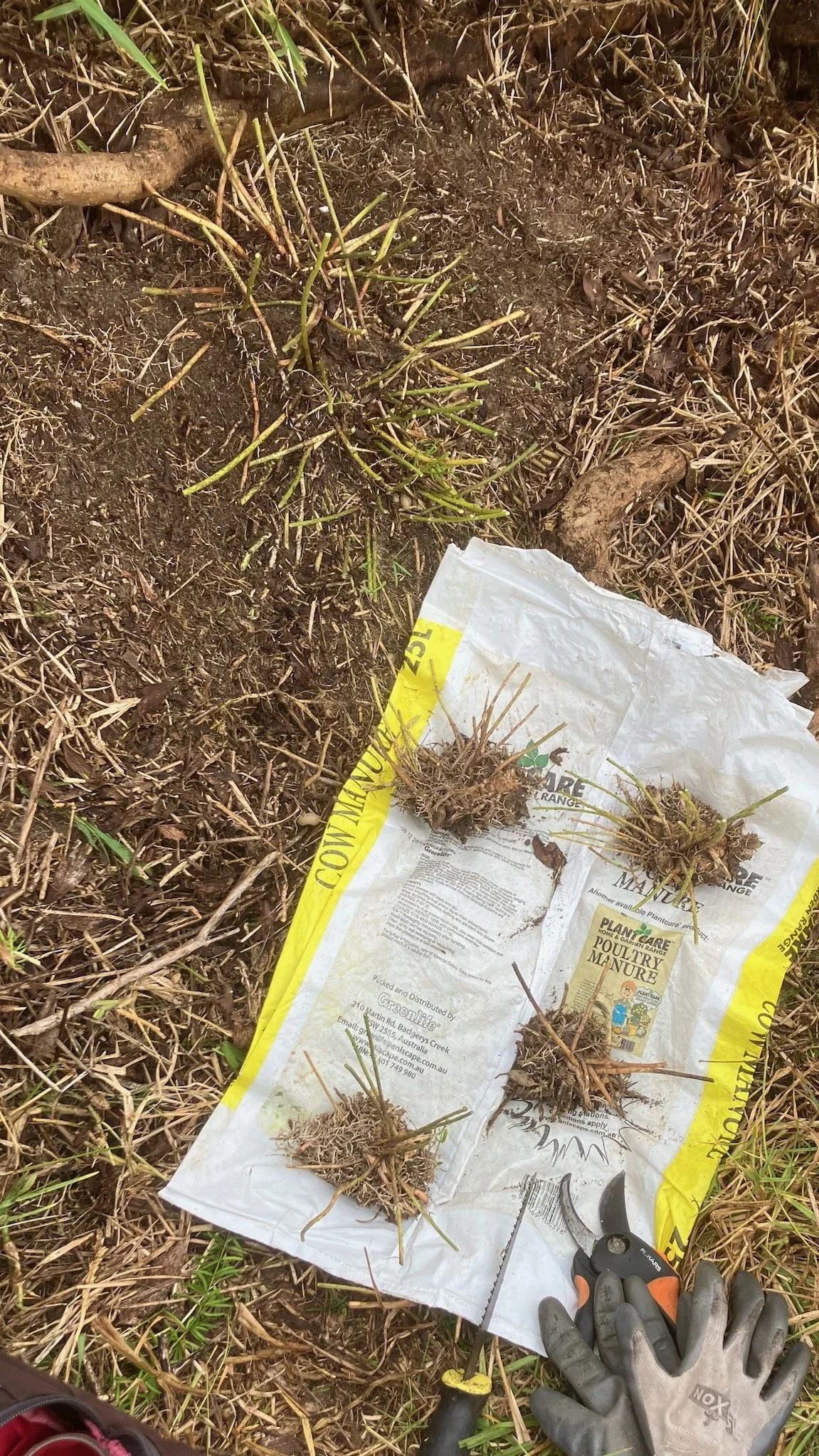 Lisa and Alex collaborated to collect seeds and bulbs before rain interrupted briefly at 10 am. Undeterred, we pressed on, uncovering unexpected grass beneath the pigs face, potentially native couch. Further back, Kikuyu grass posed a future challenge, noted for follow-up with Jock from NBC.
