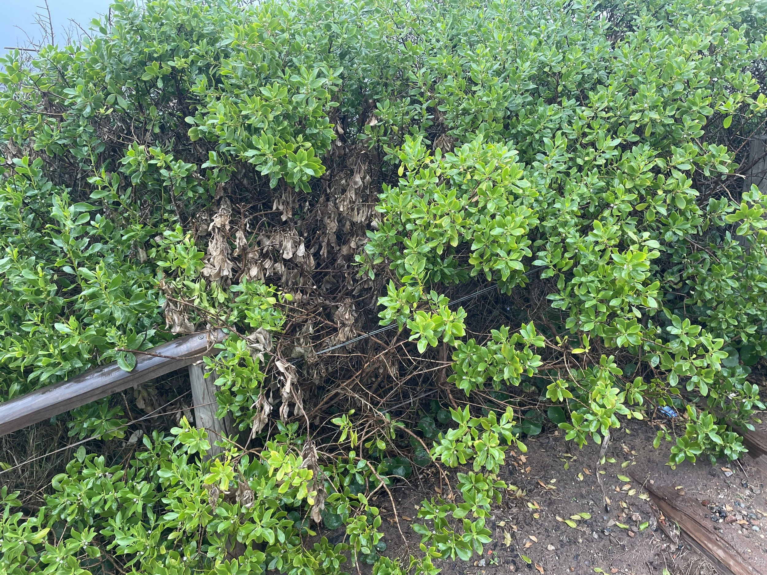 Bitou bush that was poisoned in last month's bushcare session is dying, but the native plants (Myoporum) are thriving! Great outcome!