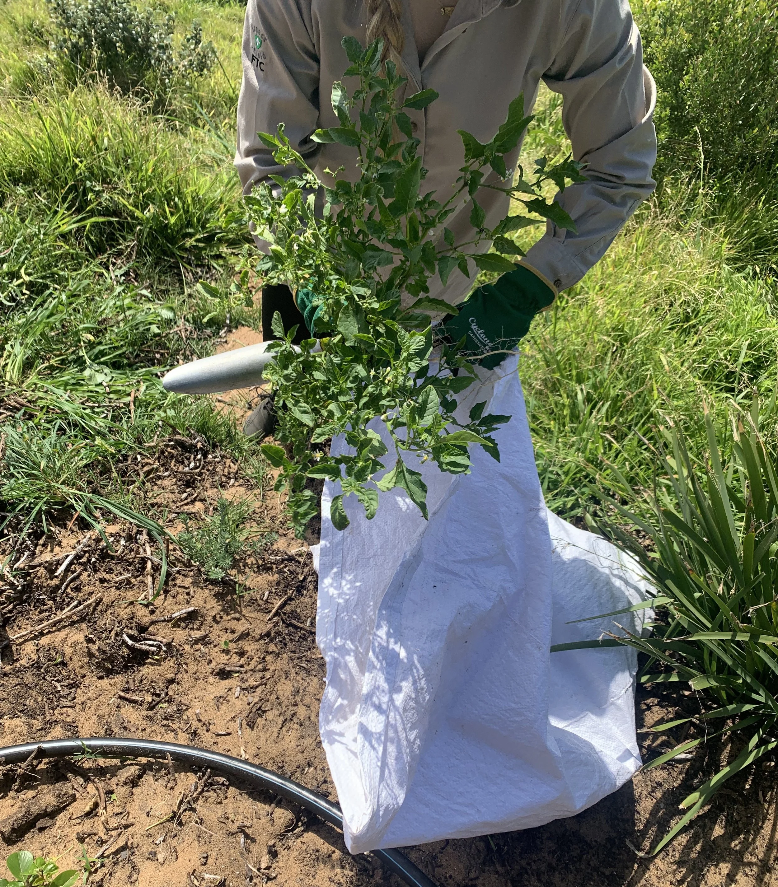 At the top of the hill two volunteers worked on continuing to prevent asparagus fern spread. We removed some of the smaller crowns but mainly focused on removing the berries to prevent new plants from establishing in other areas of the site via birds. Misima said: “You will not believe the amount of berries that we collected and bagged.”