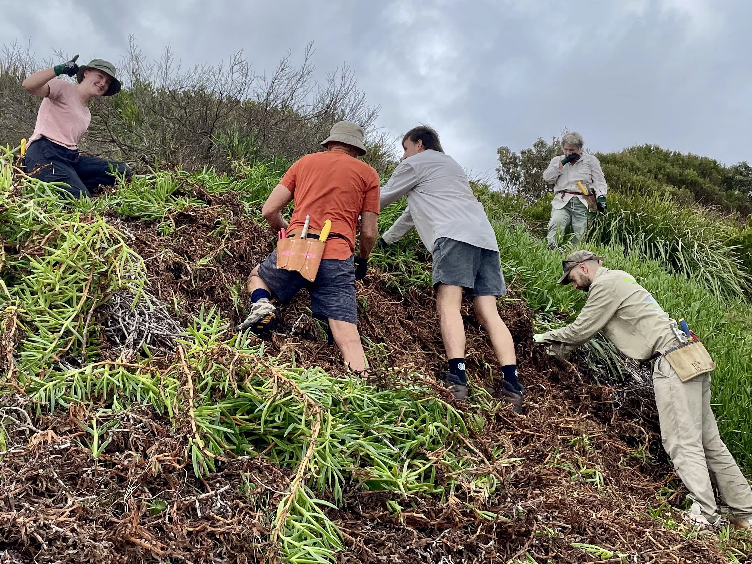 Volunteers got their hands dirty removing Pigface, tackling Asparagus Fern, and planting native tube stock to help restore the dunes.