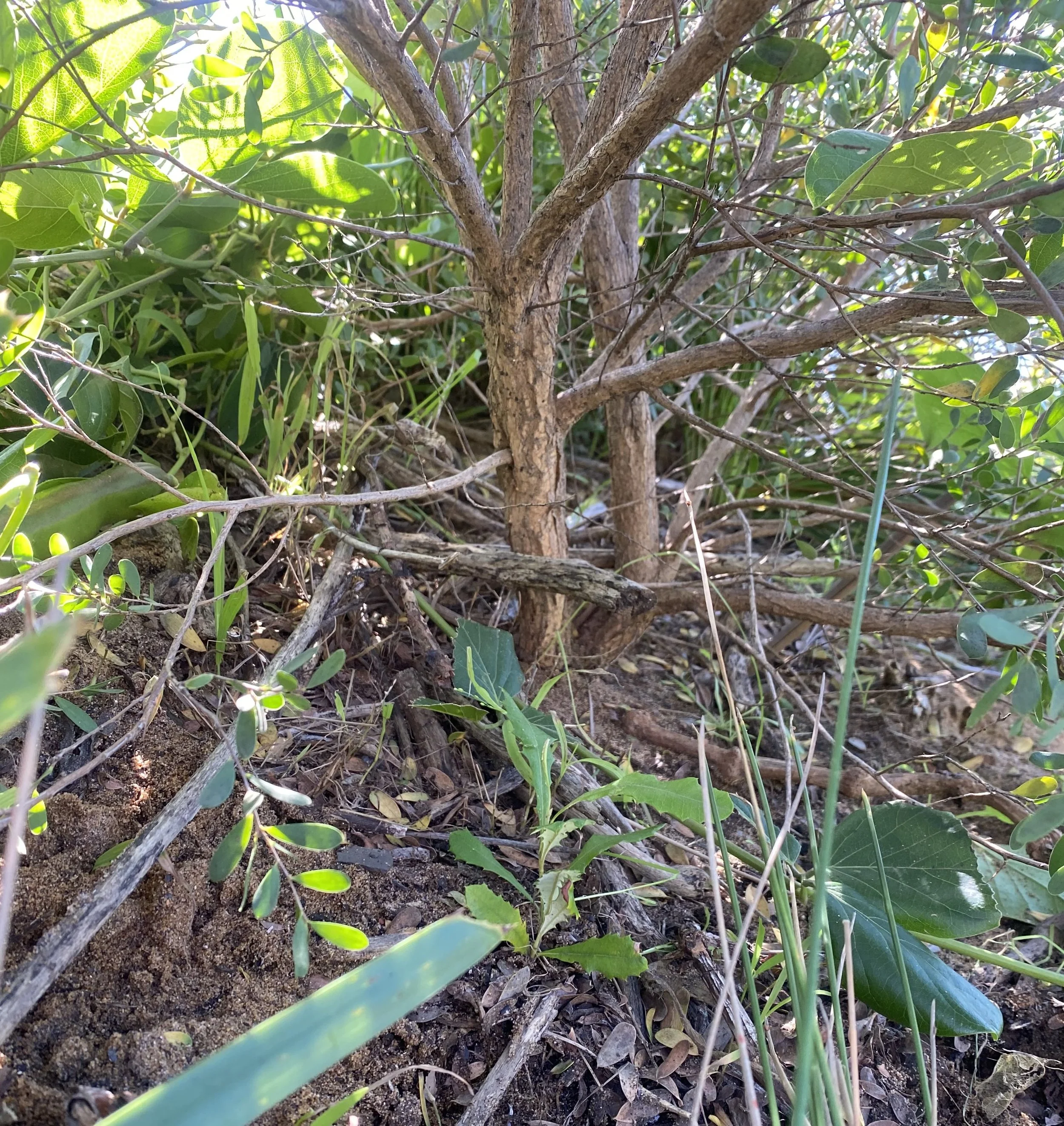 As we worked westward, pulling up non-native pigs face, Alex made a significant find: a large amount of Turkey Rhubarb entwined with Acacia roots, a species known for its rapid spread and ecological impact in coastal areas.