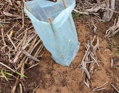 After planting a plastic guard is put around the plant to not only protect it from rabbits, but it help keeps the moisture with the guard so that the plant does not dry out. Once established, the guard is removed.