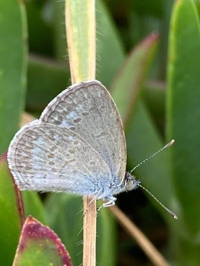 Des scoured the site for Asparagus fern which he also did last month and had a bag full by morning tea. And talking about morning tea – we were like excited children in a school yard – there were so many of the small blue butterflies all over the site, it was very beautiful to see and rather exciting. Everyone was talking of them during morning tea. We are lucky as one of our members is studying entomology at University, and Genevieve Law was able to identify these as the Common Grass-blue from the tribe Polyommatini. Gen Law wrote ….These butterflies look like Lycaenidae (‘blues’) – they are generally quite small, somewhat furry and grey/blue in colour. They are often cryptic at rest, and you often can only see the blue colour when they open their wing.”
