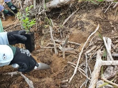 As the slope is so steep and the basically sandy soil can readily collapse, we create a mini retaining wall above the trough, (see the use of the previously cut Bitou to create this retaining wall) then did a hole for our tube stock plant in front of the retaining wall.